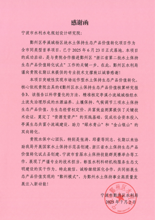 鄞州區(qū)水利局在感謝信中特別指出,我院提供的技術(shù)支持不僅專(zhuān)業(yè)高效,更體現(xiàn)了強(qiáng)烈的責(zé)任意識(shí)和服務(wù)意識(shí)。信中高度贊揚(yáng)了水保中心團(tuán)隊(duì),特別是張濤、邱豪等同志,在相關(guān)工作中展現(xiàn)的嚴(yán)謹(jǐn)務(wù)實(shí)的工作作風(fēng)、精益求精的專(zhuān)業(yè)態(tài)度,以及不辭辛勞的奉獻(xiàn)精神。這份肯定不僅是對(duì)項(xiàng)目組的褒獎(jiǎng),更是對(duì)我院全體職工莫大的鼓舞和激勵(lì)。