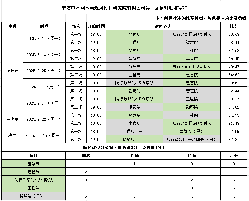 八月盛夏,激情點燃。寧波市水利院第三屆"智慧杯"職工籃球聯(lián)賽在集士港體育公園籃球場火熱開幕!這不僅是一場競技的較量,更是一次寧波院人團(tuán)結(jié)拼搏、斗志昂揚的集中展現(xiàn)。經(jīng)過兩個月的鏖戰(zhàn),最終勘察院隊強(qiáng)勢問鼎冠軍,建管院隊與院行政部門&規(guī)劃聯(lián)隊分別獲得亞軍、季軍?,F(xiàn)在,就讓我們一同回顧這段充滿汗水與激情的籃球時光!